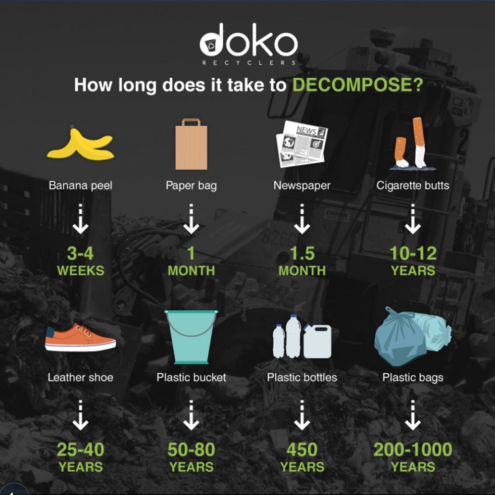 To get a better idea of why segregating your waste and practicing recycling is so important, below is a list of how long some common items take to decompose: