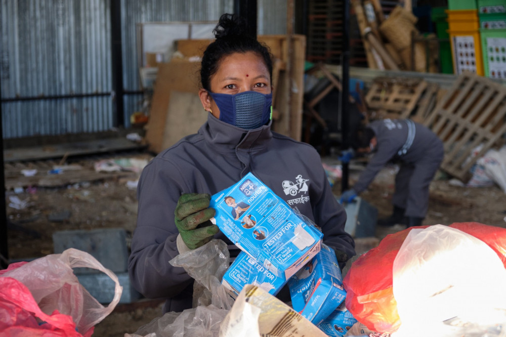[Non-recyclable waste includes hazardous waste such as broken glass and needles, sanitary waste such as used masks and gloves, sanitary pads and diapers as well as nonrecyclable material such as multilayer plastics (noodles, chocolates, and biscuits packaging) and styrofoam. In particular, any biomedical waste that has bodily fluid such as diapers, sanitary pads, and used napkins may contact bacteria or viruses that spread diseases such as COVID-19.]
